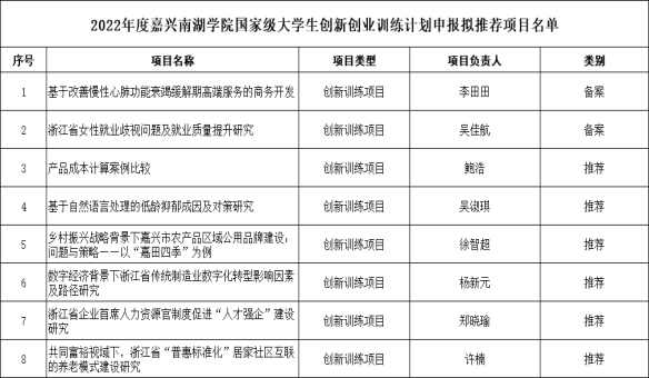 根据教育部《国家级大学生创新创业训练计划管理办法》(教高函〔2019〕13号)和《嘉兴南湖学院大学生创新创业训练计划项目管理办法》(嘉南院教字〔2021〕19号)的有关规定,经项目团队申报,学院组织专家评审,拟推荐以下8个项目申报嘉兴南湖学院国家级大学生创新创业训练计划项目。