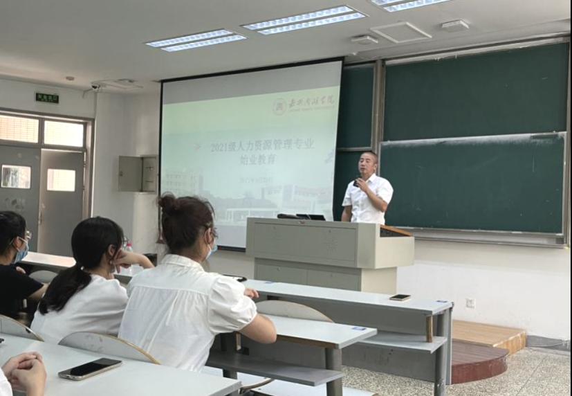 始业教育由专业负责人杨婷华老师主持,专业全体教师和2021级新生参与。人力资源管理专业教授孔冬首先发言,孔教授向同学们简单介绍了本专业的发展历史和重要地位,强调了“人力资源是第一资源”,同时还向大家提出了三点要求:第一,人力资源管理是管理人员的工作,要求大家作为人力专业的学生应具备更高的职业素养;第二,人力资源管理是与人打交道的工作,要求大家多与同学沟通,加强交流,培养自己的情商;第三,人力资源管理是无法替代的工作,要求大家提高实际应用能力,培养创新思维。