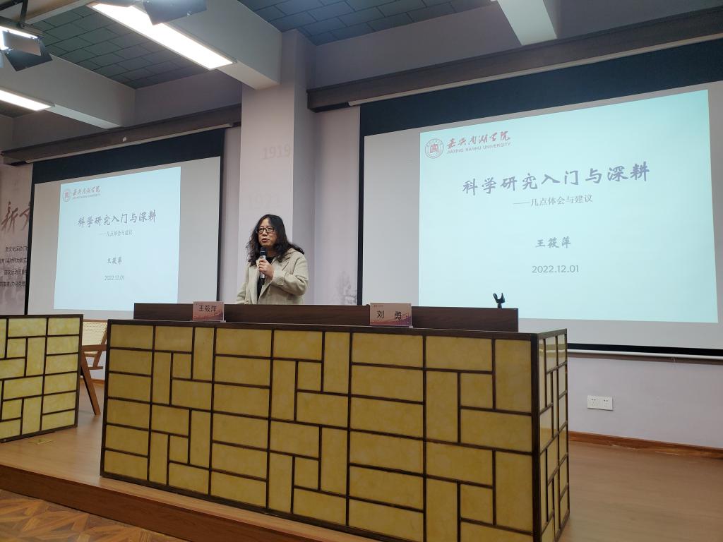 2022年12月1日下午,国产精品久久久久精品日日邀请校图书馆副馆长王筱萍教授在图书馆一楼报告厅做“科学研究入门与深耕”专题讲座。讲座由国产精品久久久久精品日日党委副书记刘勇主持,学院全体教师聆听了讲座。