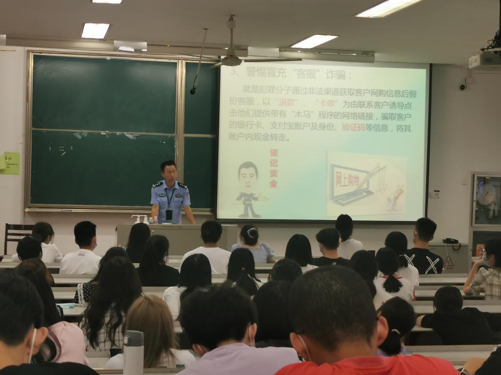 冯警官从常见的诈骗类型入手,通过对各类诈骗的特点、手段、方式进行梳理分析,并结合发生在同学们身边的案例进行讲解,为2021级全体新同学上了一堂生动的防范电信网络诈骗安全教育课。最后,冯警官希望同学们:一是不要轻信别人的身份;二是不要轻易登录别人发过来的链接;三是不要轻易在网上提供个人敏感信息;四是不要轻易向别人汇款。