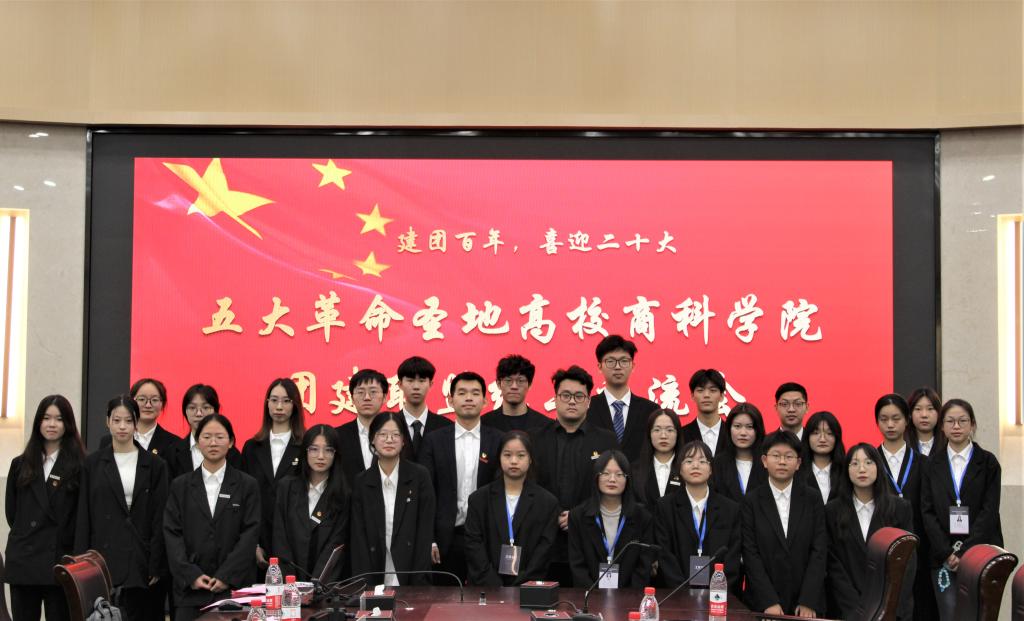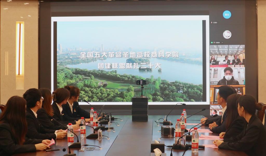 会上,大家观看了全国五大革命圣地高校商科学院团建联盟献礼二十大的原创合唱视频——《强国一代有我在》。随后,五所高校学生代表分别作主题报告,报告集中体现了以红船精神、井冈山精神、遵义精神、延安精神、西柏坡精神为代表的革命精神在新一代青年身上的延续以及红色力量的传承。会议的最后五大高校与会人员全体起立,由各校学生代表领读誓词,举起右拳庄严重温入团誓词。