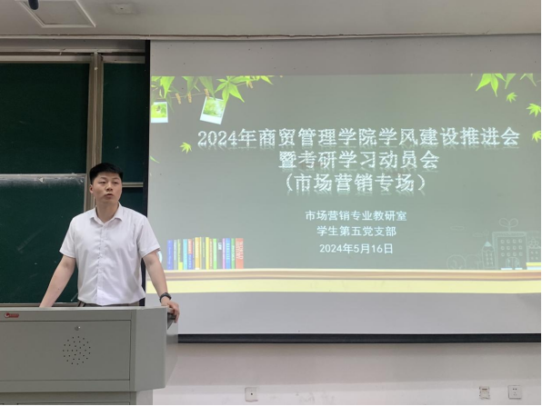 为持续推进学校学风建设,积极引导市场营销专业学生明确学习目标,激发考研热情,做好学业规划,5月16日下午,市场营销专业举行学风建设推进会暨考研学习动员会,市场营销专业负责人俞杰龙,专业教研室全体教师以及市场营销专业全体学生190余人参与活动,活动由辅导员付晓豪主持。