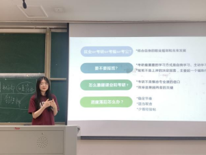 会议伊始,俞杰龙老师从“考研专硕与学硕的选择”“考研院校与专业的选择”“嘉兴南湖学院考研服务”等三方面出发向同学们介绍了本专业考研风向与学院内外考研信息获取渠道等。他指出,考研能让同学们拥有更充实、更深层次的大学生活,同时也能够让同学们有机会获得能够实现更高价值的就业岗位,而在备考前做出清晰的规划与选择对于考研学子来说也至关重要。