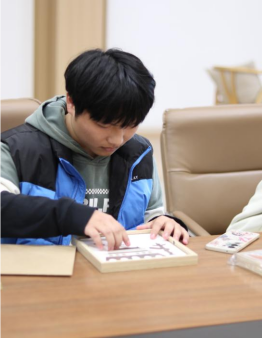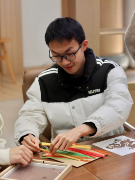 实践环节中,同学们在李老师的带领下,开始动手体验竹编制作。大家小心翼翼挑选竹条,学习“压一挑一”的基础编织手法,通过反复调整定型,逐渐将零散的竹条编织成方正平整的竹编板。之后,同学们将主题的图案卡片嵌入竹编板中,并装裱成独具韵味的竹编相框画。经过两小时的耐心尝试与合作,一件件融合非遗技艺的竹编作品陆续诞生。大家纷纷举起自己的竹编画合影留念,现场洋溢着成就感与欢声笑语。