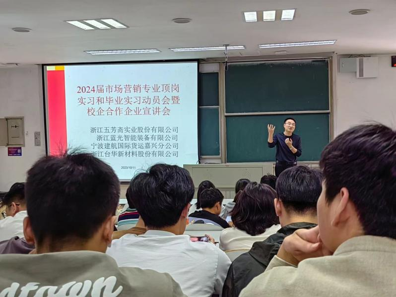 为进一步拓展就业资源,搭建用人单位与毕业实习生的双向选择平台,推动市场营销专业学生的高质量就业,10月11日下午,市场营销专业于教一159教室举办企业实习宣讲会。浙江五芳斋实业股份有限公司、浙江蓝光智能装备有限公司、宁波建航国际货运嘉兴分公司、浙江台华新材料股份有限公司四家公司企业代表进行宣讲,市场营销专业学生积极参与。会上,市场营销专业负责人俞杰龙副教授对现在的就业环境以及本次宣讲的企业进行了详细介绍,鼓励学生积极投递简历,把握就业主动权。